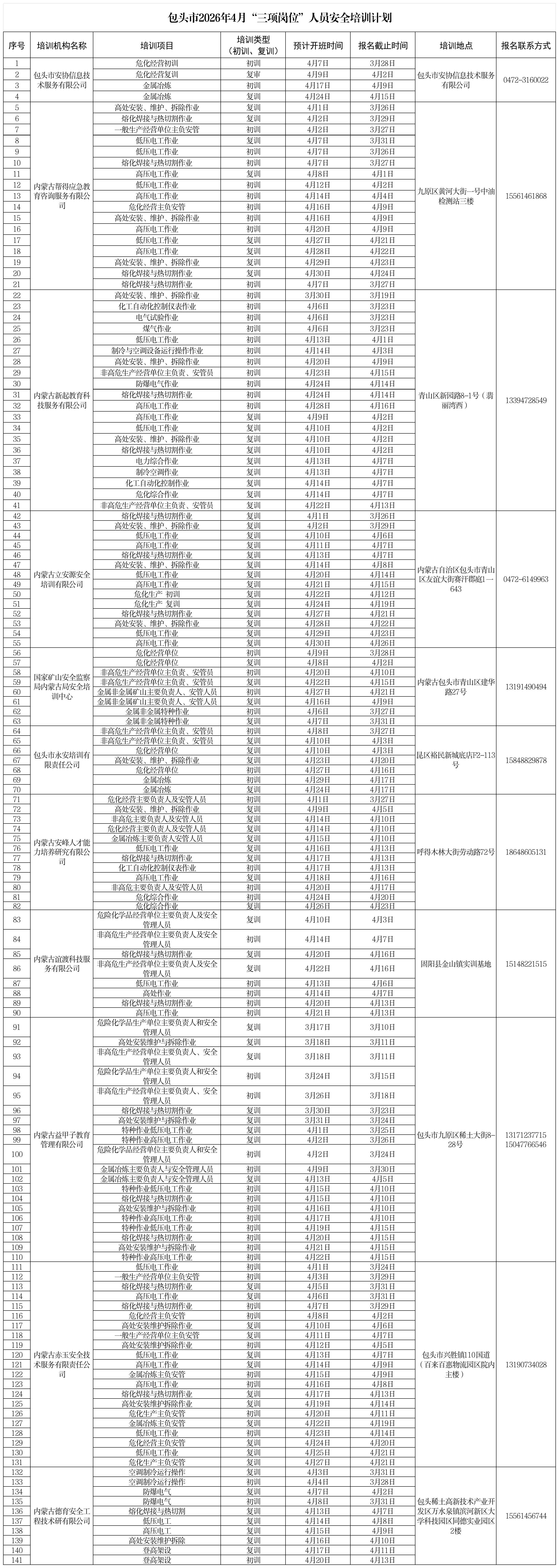 包头市应急管理局汇总全市范围内符合条件的培训机构安全生产“三项岗位”人员4月份培训计划,并向社会公布。便于相关企业及考生提早规划,根据自身需求选择培训机构报名培训。